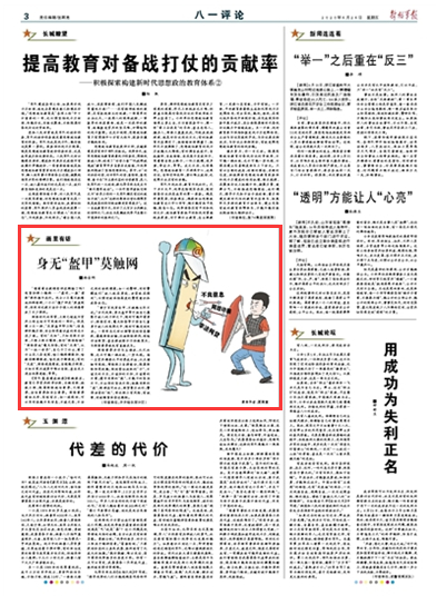 网络时代的军营,上网已经成为官兵工作生活不可或缺的一部分。但是像小王一样,“没穿盔甲即上阵”,信息辨别能力弱、安全防范意识差的同志不在少数。有的“无知”,只知用网不识网,只想上网不懂网,面对“网络险滩”“网络禁地”毫无防备;有的“无畏”,认为“一机一世界”,自己干了什么、看了什么没人会发现,啥二维码都敢扫、啥微信群都敢进、啥灰段子都敢发;有的“无度”,网络道德滑坡,自控能力较弱,不知不觉沉迷其中难以自拔,甚至走上违法犯罪道路,等等。