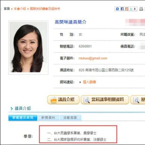 官方资料显示,高闵琳毕业于台大,本科专业是昆虫学,研究生主修法学。