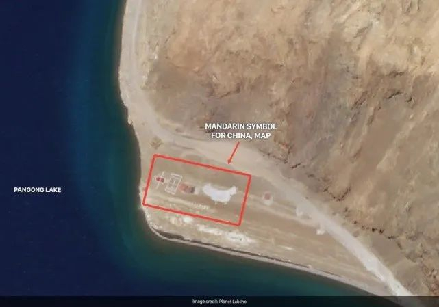 据印度NDTV报道,卫星图像显示,在班公湖中方一侧的土地上出现一副巨大的图案,包括汉字“中国”和一幅中国地图。