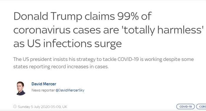“天空”新闻:随着美国新冠感染病例激增,特朗普声称99%的新冠病例“完全无害”