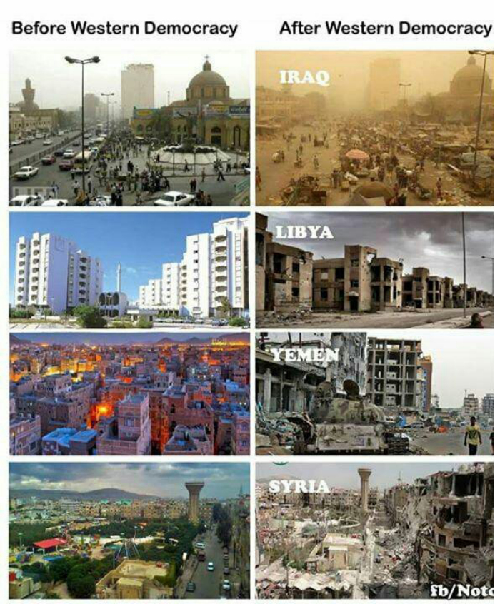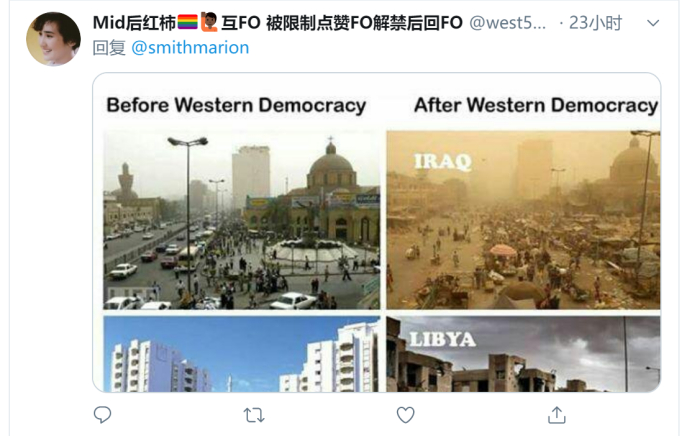 7月4日“独立日”当天,史密斯又发推扯上中国。而在他那条推文下,有网友直接甩出所谓的“西方民主”降临到伊拉克、利比亚等国前后的对比图,进行了生动驳斥↓