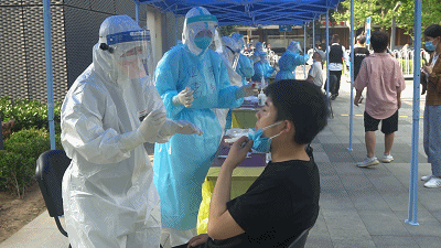 ▲北京市建外街道的工作人员正在为市民进行核酸检测。(北京日报客户端)