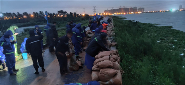 新华社武汉7月9日电(柯于光、向海峰)7日晚8时许,湖北省黄石市大冶湖水位超警戒水位近1.5米,同时,园博园段堤坝发生多处渗漏险情,严重威胁周边群众生命财产安全。铁山区人武部组织民兵100人冒雨驰援,截至8日晚22时,成功封堵渗漏点,并装填搬运砂石袋8000余袋,加高险段堤坝近1公里。