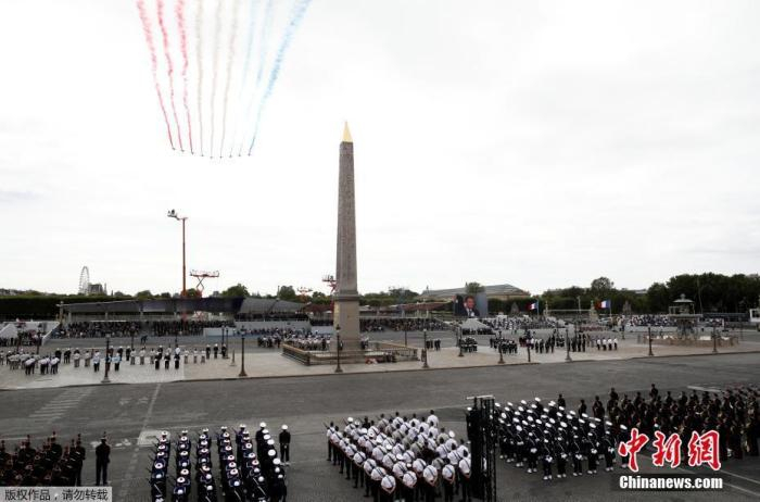 当地时间7月14日,法国巴黎, 法国一年一度的国庆阅兵式在协和广场举行。受疫情影响,法国总统马克龙没有在香榭丽舍大街举行国庆阅兵式,而是在协和广场举行小型庆祝仪式,向在抗疫斗争中做出贡献的公民致敬。
