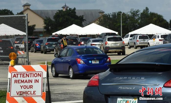 当地时间7月15日,美国佛罗里达州,当地人开车排长队等待接受新冠病毒检测。 图片来源:视觉中国
