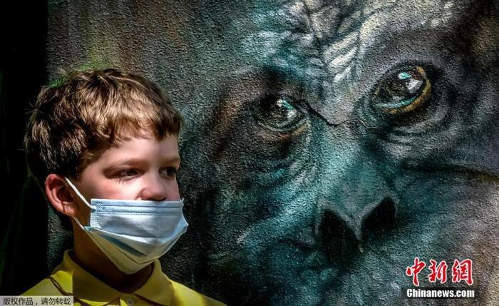 当地时间6月16日,俄罗斯莫斯科动物园重新开放,一名戴口罩的男孩儿站在动物壁画前。