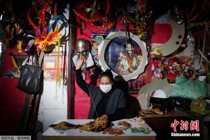 当地时间2020年7月9日,秘鲁普诺,传统刺绣艺术家尤兰达在她的家庭作坊里手工缝制口罩。