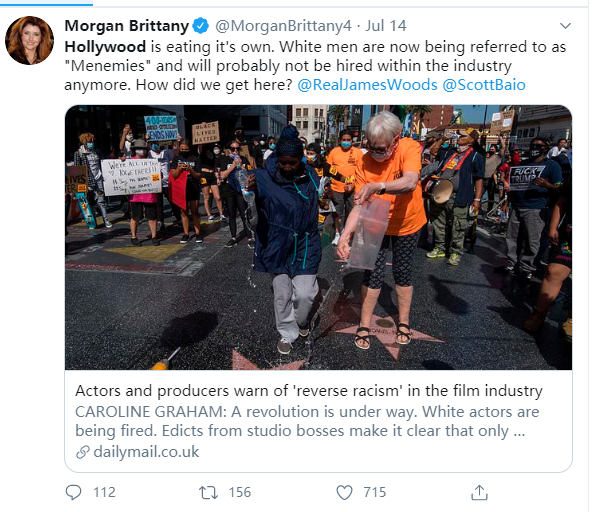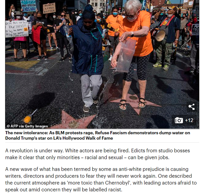 之后,该报称许多接受采访的好莱坞演员、编剧和制片人都表示,好莱坞正在发生一场“革命”,而且“革”的是白人的命:许多白人演员被解雇开除,许多工作室更表示他们接下来将只雇佣黑人等有色人种或是同性恋、变性人等性少数组群。这令很多好莱坞的白人从业者担心这种“反白人”的歧视性观念将导致他们再也无法在这个行业中工作。