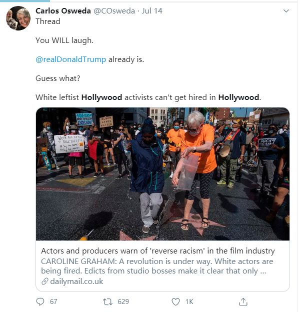 该报称,一名在好莱坞颇有影响力的黑人女导演就曾在社交媒体上发帖说,“尽管每个人都有权拥有自己的观点,但雇不雇谁的权力在我们黑人制片人的手上,我们有权不雇那些轻视我们的人,所以对于那些在我帖子里吐槽的白人,如果你们找不到工作,就请你们记住歧视就是会反噬你们的,而且现在已经是2020年了。”