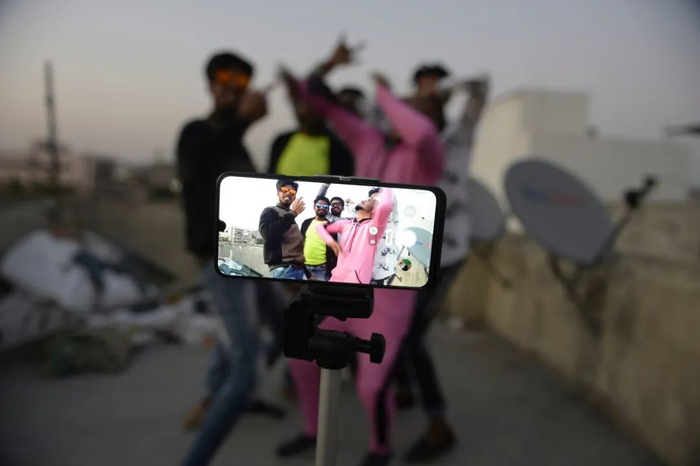 今年2月,印度海得拉巴,一群年轻人在自家屋顶上拍摄TikTok视频