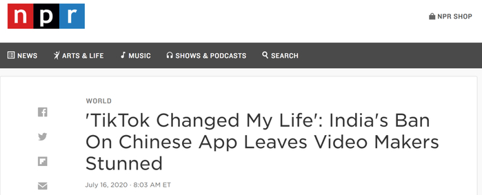 美国全国公共广播电台:“TikTok改变了我的生活”:印度对中国App的禁令震惊视频制作者