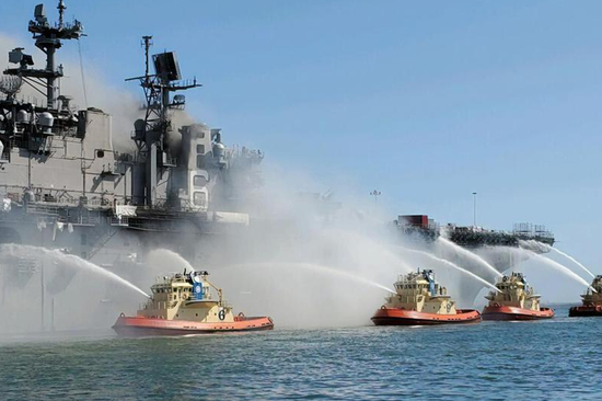 [环球时报特约记者 张达迎]吨位超过轻型航母的美国“好人理查德”号两栖攻击舰熊熊燃烧的大火持续了4天,让美国海军在世人面前大丢颜面。“好人理查德”号呛人的浓烟尚未消散,它的姊妹舰“基萨奇山”号17日也在维修中发生火灾。美国媒体18日总结称,接连发生的火灾事故显示,这些都是美国海军长期漠视消防安全的恶果。