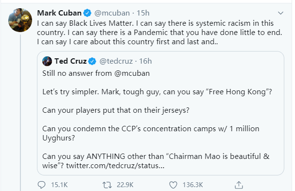 库班先是表示:“我可以说黑人的命也是命,我也可以说美国存在系统性的种族主义,我还可以说,在这次疫情中,你克鲁兹几乎什么都没做。我可以说这些话是因为我首先关心、在乎的,是我的国家。”