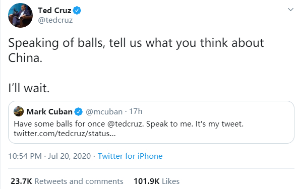 如下图所示,克鲁兹先是对库班发了一则网贴,内容是“说起有没有种,告诉我你怎么看中国”。