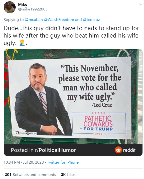 最后,有美国网民介绍说,克鲁兹对于库班说他“没种”之所以会那么介意,是因为特朗普曾经嘲讽克鲁兹的老婆长得丑,可克鲁兹不仅没有骂回去,反而还在特朗普当选为总统后,成了特朗普的“舔狗”……