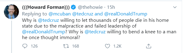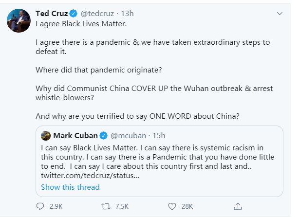尽管这些网民乃至库班本人,在一些涉及中国事情上也与我们国人存在较大的认知差异,但他们至少清楚在美国疫情失控已经导致大量人员死亡的情况下,克鲁兹这样的美国政客,应该先搞清楚为什么在特朗普领导下的美国,会出现这种问题,而不是给特朗普洗地,或是把矛盾转移给中国。