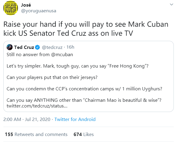 之后,见库班没理会他这种莫名其妙的“跳跃式思维”,克鲁兹又恼羞成怒地发了下面这段贴文,问库班敢不敢说“光复香港”,敢不敢把这句口号印在球员衣服上,以及敢不敢“谴责”新疆所谓的“集中营”——似乎在克鲁兹看来,敢造谣干涉中国内政,才是“有种”的行为。