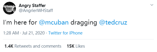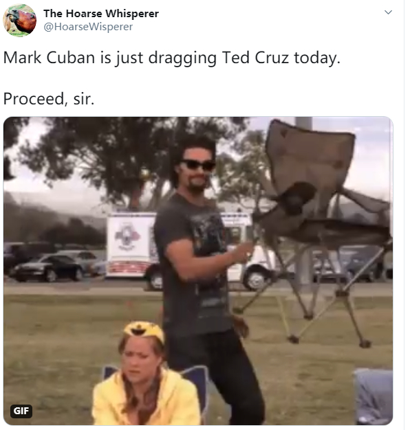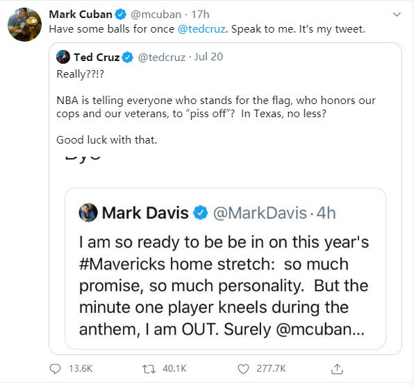 但克鲁兹并没有直接@出库班,而是发了一个库班贴文的截图。于是,库班在看到克鲁兹对他的攻击后,便反击说:“你能有点种么,克鲁兹?那是我发的贴文,你不妨直接来和我聊聊”。