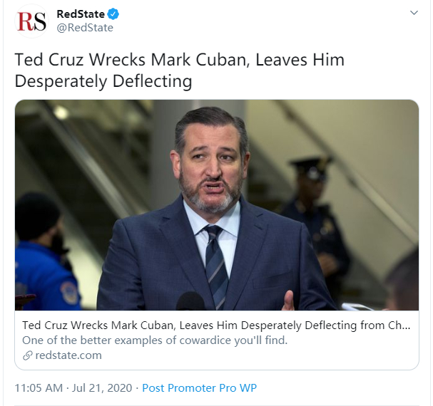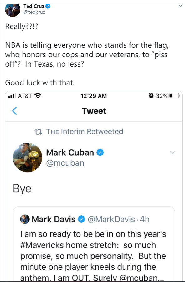 但库班的这个简单的回应,却让原本在一旁围观的克鲁兹坐不住了。在北京时间今天(21日)凌晨1点半左右,克鲁兹就发了一个贴文,用他惯用的歪曲事实和加油添醋的手法,造谣说库班的那个回应是要让所有“爱国旗爱警察爱老兵”的人都滚蛋。