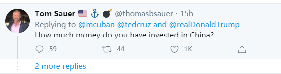 但也有常年在美国社交平台上活动的大量反华水军和特朗普的支持者,在为克鲁兹摇旗呐喊,并造谣说库班“被中国收买了”、“库班通中”等等。