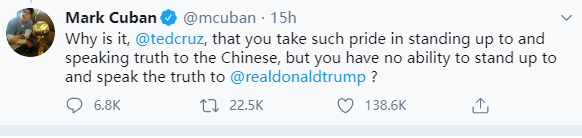 但克鲁兹拿中国挑衅库班的做法,却成了他自己最大的破绽,很快就被库班怼得体无完肤。