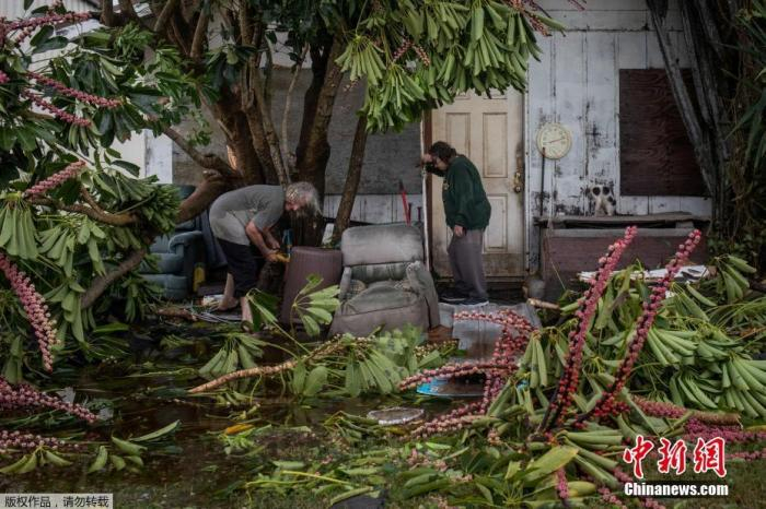 当地时间7月26日,美国得克萨斯州曼斯菲尔德港,飓风过后,一对老夫妻在调查房屋的损毁情况。