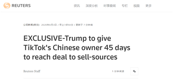 路透社独家:特朗普给字节跳动45天时间协商出售事宜