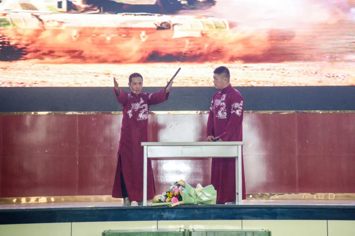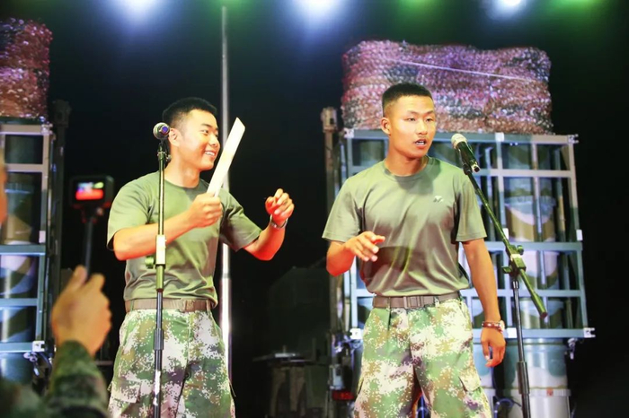 相声《亮剑》的表演者是老搭档薛克敏和时佶,他们将真实的驻训生活融入脚本,引起官兵强烈共鸣,诙谐幽默的话语激励着官兵敢打必胜的决心和勇气。