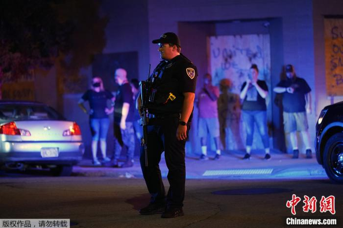 当地时间2020年8月25日,威斯康星州基诺沙,一名警察站在抗议者聚集的街道上。