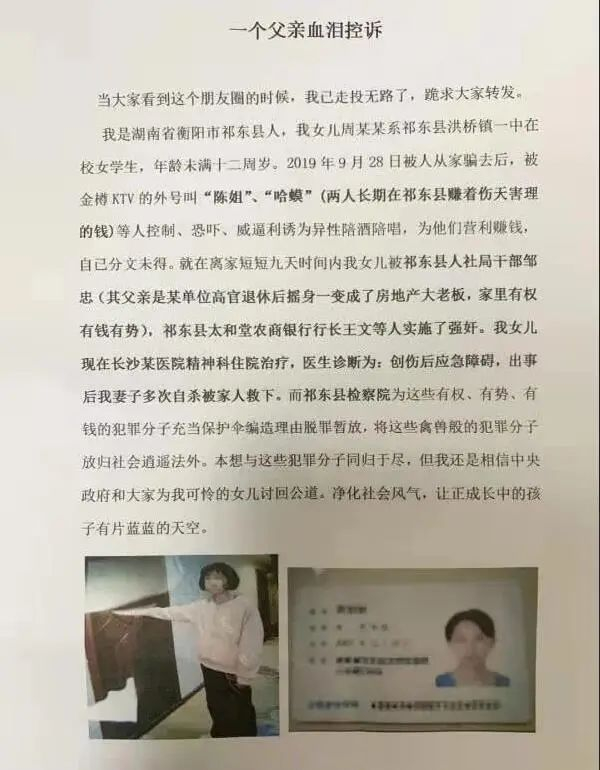 周先生18日向记者反映,2019年9月28日17时许,其女儿周婷(化名)的同年级不同班的同学王某茜以辅导作业为由从家中骗走,并带至祁东县“金樽KTV”。随后,张某怡、陈某升、周某云等人以控制、恐吓、威胁等手段,迫令周婷谎报年龄为异性陪酒伴唱。其间,周婷因害怕被打,只得任由摆布。
