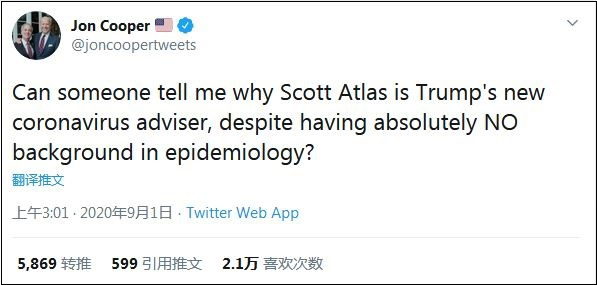 民主党总统竞选筹款委员会的主席琼·库珀(Jon Cooper)也发推质疑了阿特拉斯的专业背景:“有没有人能告诉我,为什么阿特拉斯完全没有传染病学的背景,却成为了特朗普的新疫情顾问?”