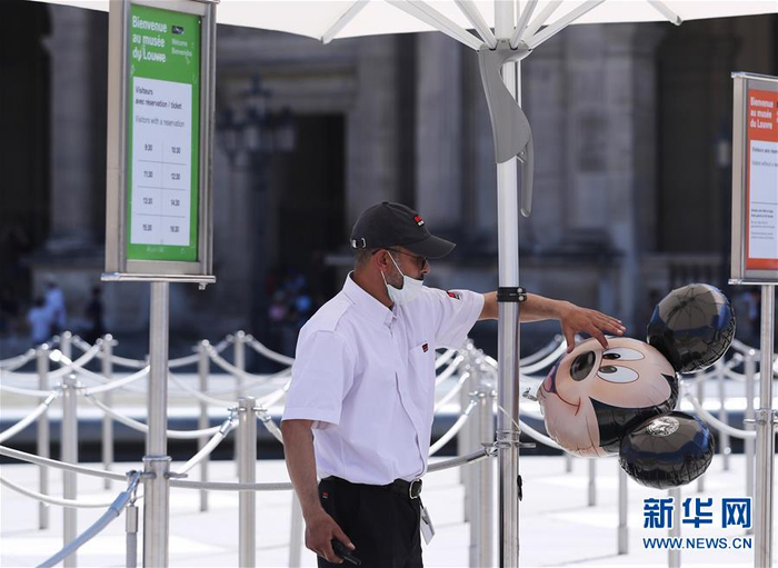 8月7日,在法国巴黎卢浮宫博物馆外,工作人员整理游客寄存的气球。 法国政府网站7日公布的数据显示,法国累计新冠确诊病例197921例,过去24小时新增2288例,创下自5月30日以来最高单日增幅。 新华社记者 高静 摄