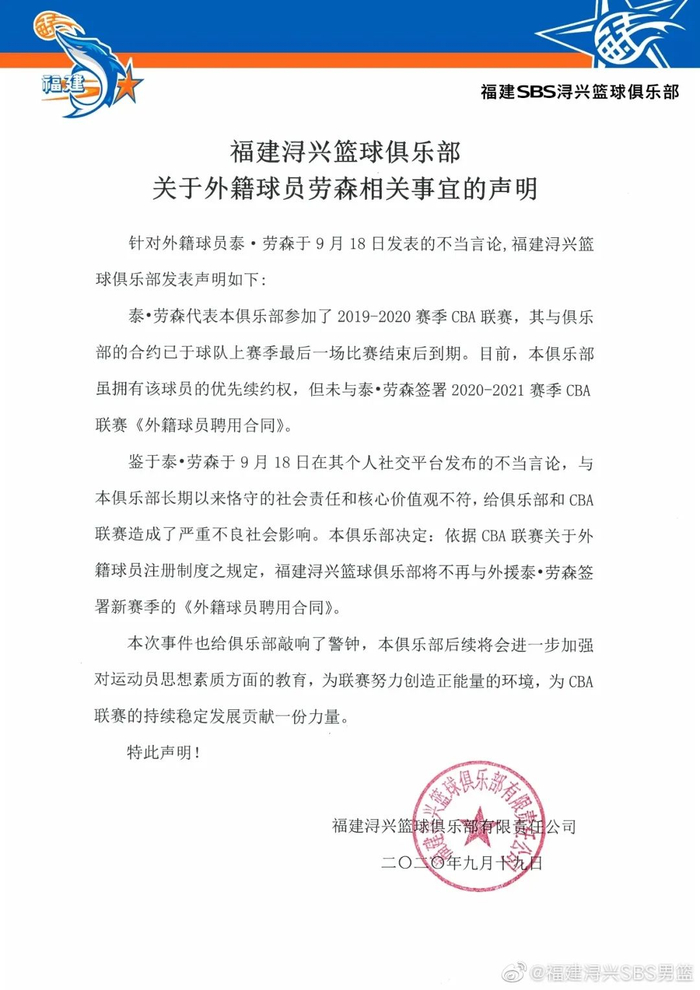 鉴于泰•劳森于9月18日在其个人社交平台发布的不当言论,与本俱乐部长期以来恪守的社会责任和核心价值观不符,给俱乐部和CBA联赛造成了严重不良社会影响。本俱乐部决定:依据CBA联赛关于外籍球员注册制度之规定,福建浔兴篮球俱乐部将不再与外援泰•劳森签署新赛季的《外籍球员聘用合同》。