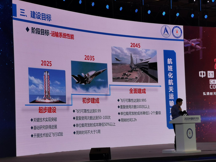 包为民表示,我国计划在全面提升新一代运载火箭性能水平基础上,计划到2045年实现1小时全球抵达、地面与轨道间以及轨道与轨道间的“航班化”航天运输。包为民透露实现这一目标将分阶段推进:2025年前为起步建设阶段,主要任务是突破关键技术,形成试验使用系统;2035年实现目标初步建成,总飞行数百次、总货运千吨级、总客运千人次;到2045年目标全面建成,实现按需发射,每年总飞行次数达到千次量级,总货运万吨级,总客运万人次。