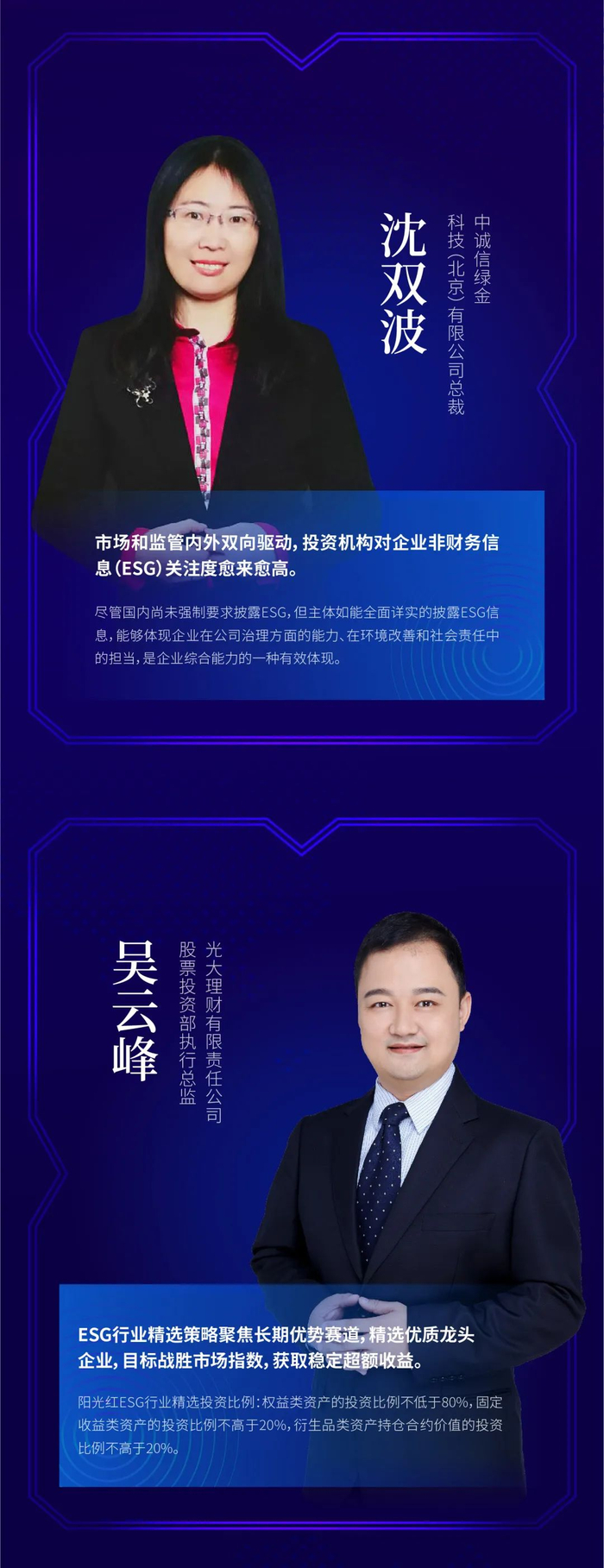优秀的理财产品离不开好的逻辑论证,光大理财股票投资部执行总监吴云峰在投资领域拥有资深的经验,从投资理念落实到产品背后的筛选机制,吴云峰认为,要通过ESG行业精选和个股评价打出一套组合拳。吴云峰介绍光大理财的投资策略是通过投资受益于中国经济增长的优质龙头企业,符合ESG标准的优质标的,去给投资者带来优厚回报。要想做到这点,吴云峰表示,需要进行长期价值投资,长期伴随优质企业成长。