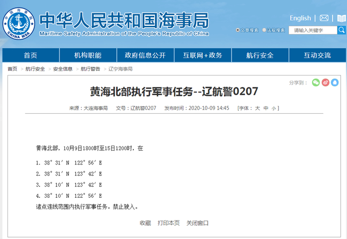 值得注意的是,大连海事局曾在10月9日发布航行警告称,10月9日18时至15日12时,黄海北部将执行军事任务。美军E-8C飞机现身黄海北部的时间也正是在中国于这一海域执行军事任务的时间段内。