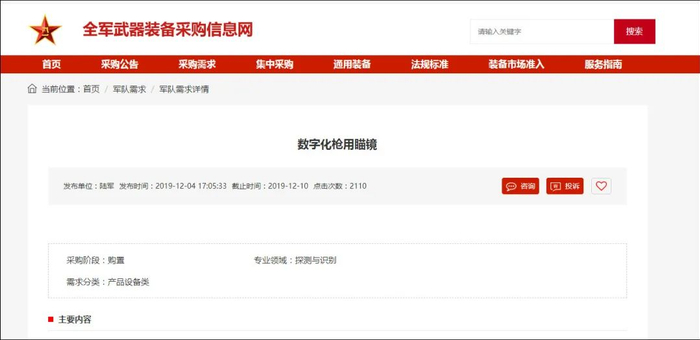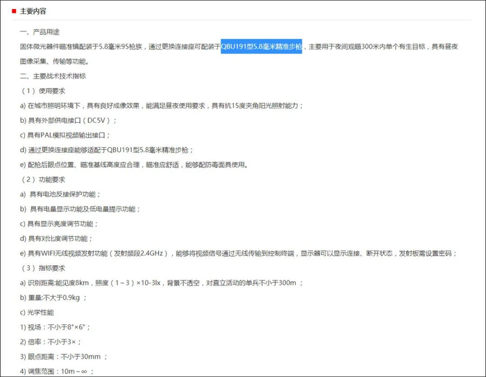 此前,全军武器装备采购信息网在去年12月4日公开发布了新QLU191精确步枪的微光瞄准镜招标报告,正式曝光了QLU191精确步枪的型号名称。从招标信息来看,新的微光瞄准镜视场、夜视距离均要比QBU88式的微光瞄准镜要高,夜视瞄准要到300米,同时还有wifi传输功能,用于下一代单兵数码夜视装备。