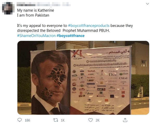 这下把多个中东国家惹火了,包括卡塔尔、科威特、约旦、土耳其、伊朗开始抵制法国产品,社交平台上出现了“抵制法国货”的话题。