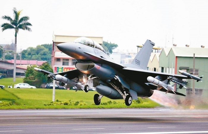 台湾地区F-16战斗机携带“鱼叉”空舰导弹起飞