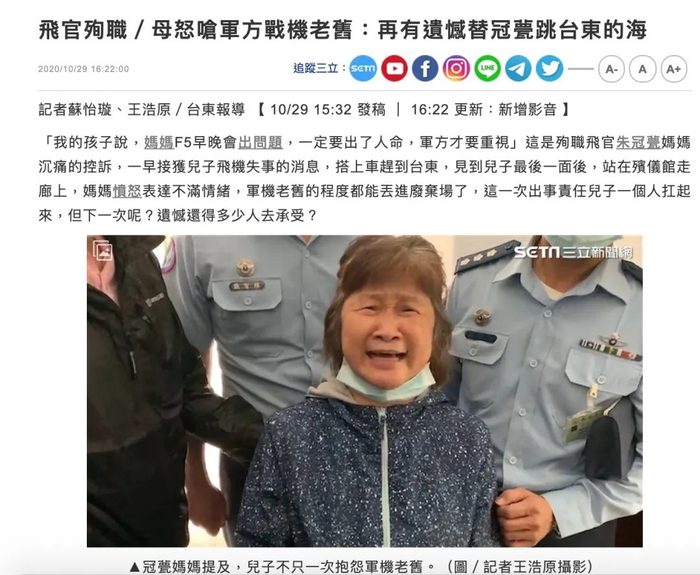 台空军一架F-5E战机今日上午7点30分起飞后,不到两分钟发动机失效战机坠入海中,台空军飞行员朱冠甍虽成功跳伞,但落入海中最终不治身亡。随后台军方和台湾省绿媒一顿操作,试图打造悲情氛围,然而这种氛围很快就被朱冠甍母亲的哭诉所“打破”,据台湾省媒体报道,朱冠甍的母亲在赶到殡仪馆后揭露,自己的儿子早就向她表示,“F-5E战机早晚会出事”,朱母痛批台军方早就知道战机老旧,却让飞行员承受压力。