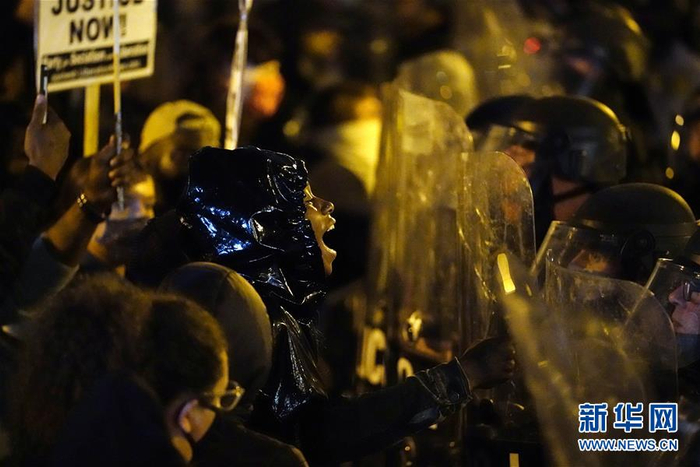 10月26日,在美国费城,示威者与警察对峙。 美国宾夕法尼亚州最大城市费城26日晚间至27日凌晨发生警察开枪打死黑人男子引发民众抗议事件,警察与示威者发生冲突,约30名警察受伤,数十人被捕。 新华社 美联