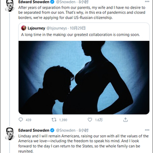 斯诺登转发推特时写道:“与父母分离多年后,我和妻子不想和儿子分开。这就是为何在这个疫情大流行和边境封锁的时期,我们申请美俄双重公民身份。”