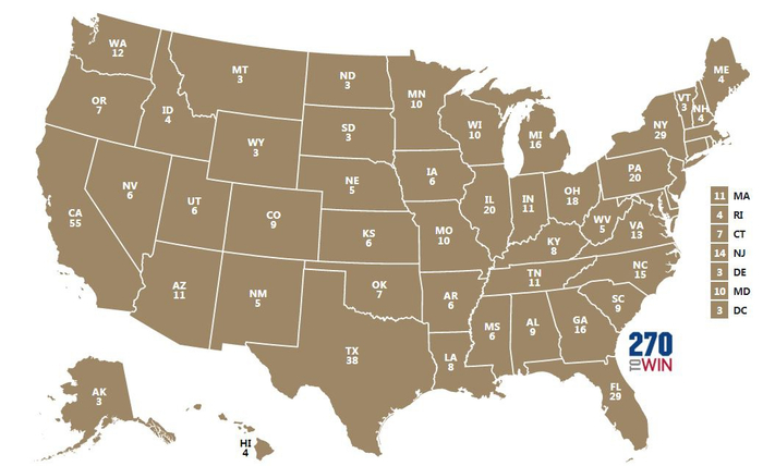 2020年美国50个州和华盛顿特区的选举人人数分布。 270towin.com 图