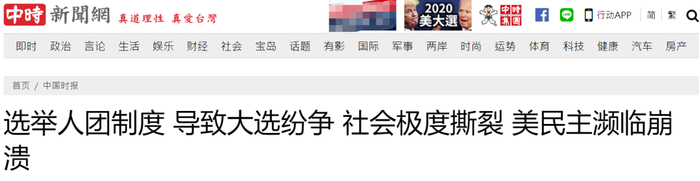 “社会极度撕裂,美民主濒临崩溃”,《中国时报》5日以此为题称,从投票前夕到选情之夜,白宫与全美各地弥漫肃杀氛围,零星打斗四起。选举人团制度间接导致大选结果迟迟无法出炉,再度遭到诟病。文章提到美国《纽约时报》曾表示,20年前布什打败戈尔,4年前特朗普胜希拉里,赢家都是靠选举人团票入主白宫,“普选票较高者多次败北,显示美国民主代表性不足”。