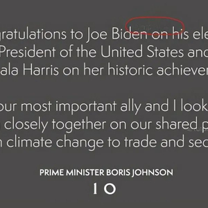当美国主流媒体宣布预计拜登当选几小时后,通过这条以图片形式发布在推特上的信息,英国首相对拜登送去祝贺,并称哈里斯“取得历史性成就”。
