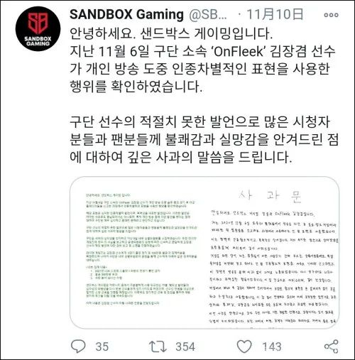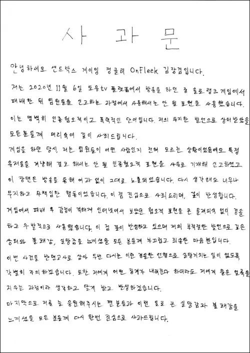 贴文还附上金长谦本人手写的道歉信。信中,金长谦解释自己是在输掉单排后举报同队队员时发表了不当言论,他承认自己并不知道队员的真实身份和国籍,“无论怎么回想,都觉得这是一种十分无知和不负责任的行为”。