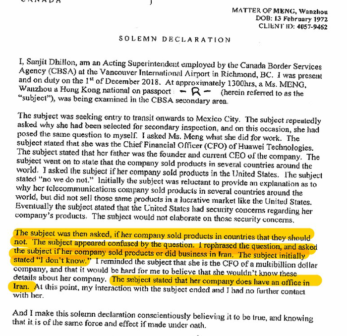事实上,迪伦连他在互联网上搜索孟晚舟和华为公司的说法也是撒谎。根据2018年12月1日的迪伦本人的工作笔记和多份官方文件,都没有迪伦搜索互联网查询此事的记录。所以可以推定,迪伦是事后编造的谎言,目的是掩盖他盘问有关华为在伊朗业务的这个反常行为。