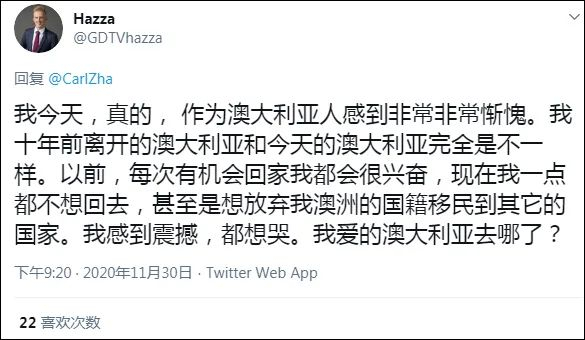 此时此刻,他作为澳大利亚人“感到非常非常羞愧”:“以前,每次有机会回家我都会很兴奋,现在我一点都不想回去,甚至是想放弃我澳洲的国籍移民到其它的国家。我感到震撼,都想哭。我爱的澳大利亚去哪了?”