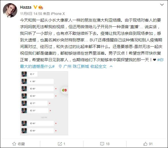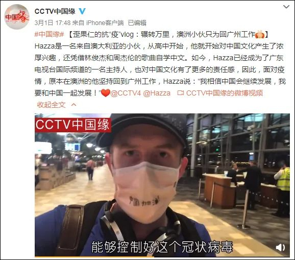 今年3月,@CCTV中国缘 发布视频“歪果仁的抗‘疫’vlog:辗转万里,澳洲小伙只为回广州工作”。原来,2月6日,Hazza就从澳大利亚出发返回广州工作,口罩上还写着“中国加油!”