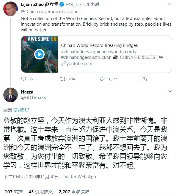 尊敬的赵立坚,今天(我)作为澳大利亚人感到非常惭愧。非常抱歉。这十年来一直在努力促进中澳关系。今天是我第一次真正考虑放弃澳洲的国籍了。